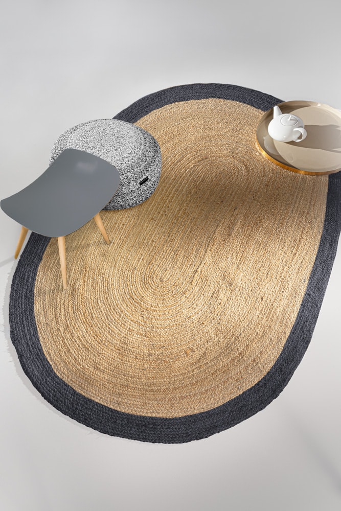 Χαλί σαλονιού σε οβάλ σχήμα με διχρωμία περιμετρικά για όλες τις εποχές του χρόνου κατασκευασμένο από 100% jute με την υπογραφή του γαλλικού οίκου Guy Laroche Paris. Διάσταση 140×210εκ.